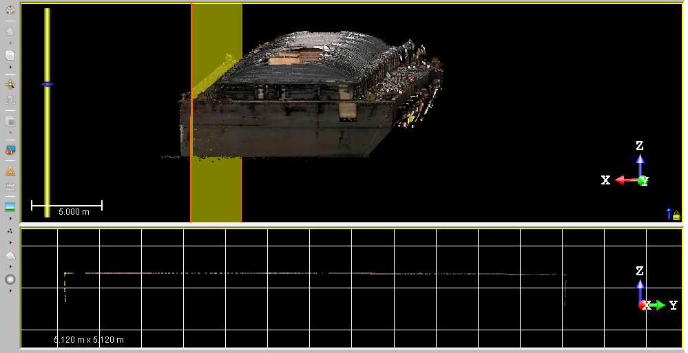 El relevamiento se realizó en aproximadamente 2hs. Se extrajeron de la nube de puntos: 60 cortes transversales (cada 1 m), y cortes longitudinales cada 0.20 m.